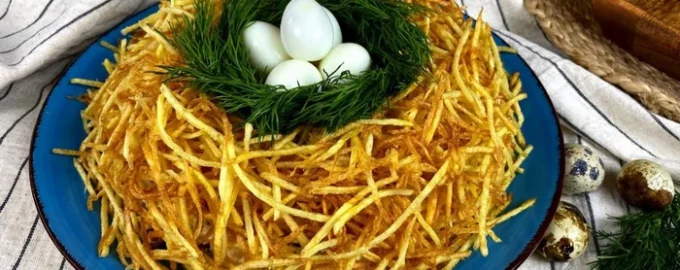 புகைப்படம்: திறந்த மூலங்களிலிருந்து இந்த அழகான மற்றும் சுவையான சாலட் ஒரு விடுமுறை அட்டவணைக்கு ஏற்றது. அசல் சாலட் “கில் வூட் க்ரூஸ் நெஸ்ட்”